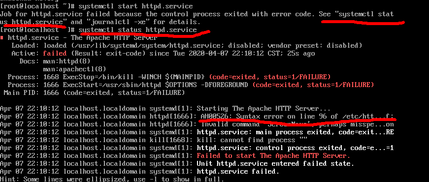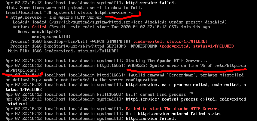 httpd.service failed 发表于 2020-04-08 | 分类于 CentOS httpd.service failed 后面都会有提示 把后面的命令输入进去就会看到错误原因 如图 错误已经指出了 但是路径没有显示完整 但是最后一句已经给出了提示了 只要在刚才的命令上加上 -l 就可以了 如图 直接 vi 打开对应的文件 然后 :set nu 显示行号 找到对应行修改即可 修改完后记得 :wq 最后 systemctl start httpd.service