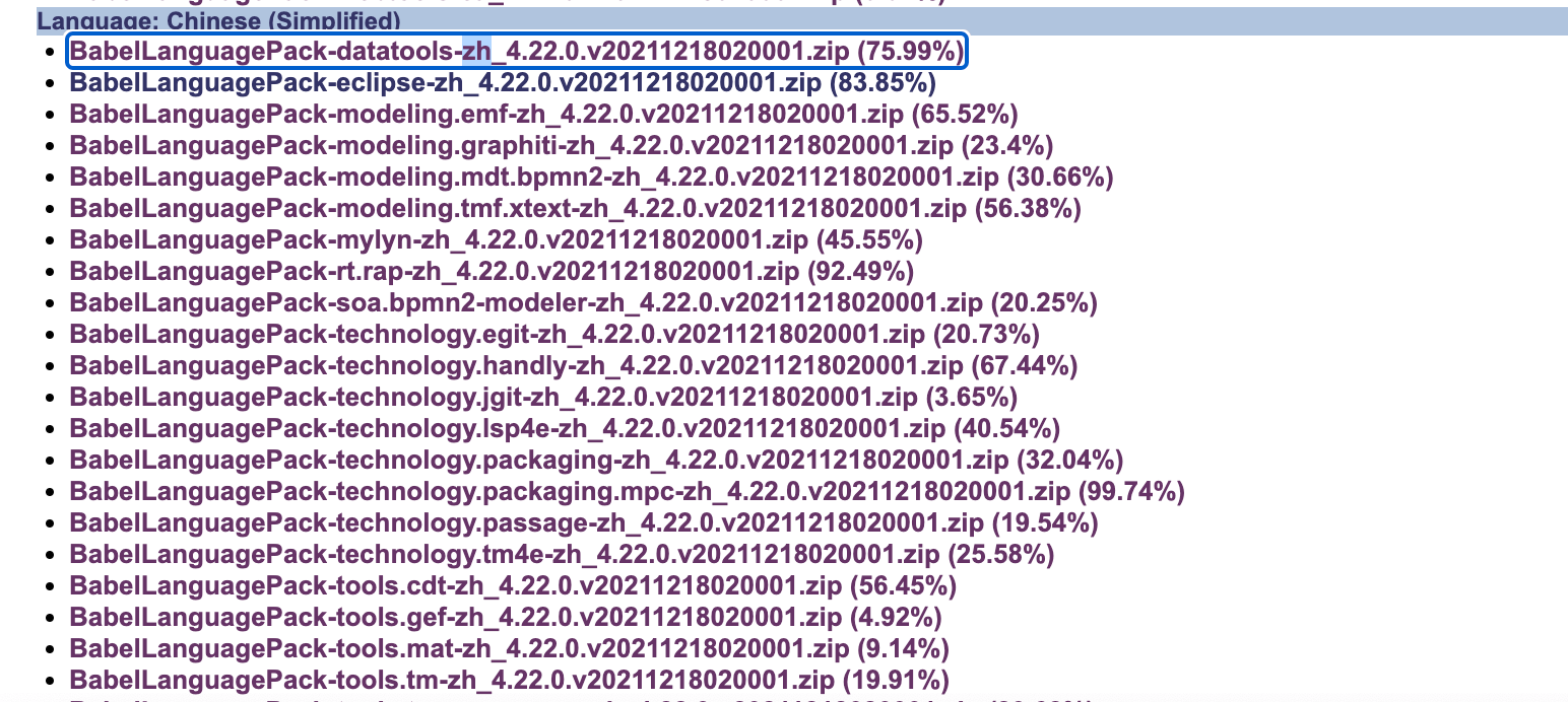 eclipse汉化 发表于 2022-07-27 | 分类于 eclipse 打开网址 https://www.eclipse.org/babel/downloads.php 找一个和自己版本相近的 然后找到BabelLanguagePack-eclipse-zh下载 下载完成之后解压会得到两个文件夹 找到安装包的位置 显示包内容 将解压的两个文件夹复制到Eclipse.app/Contents/Eclipse/dropins目录下重启即可