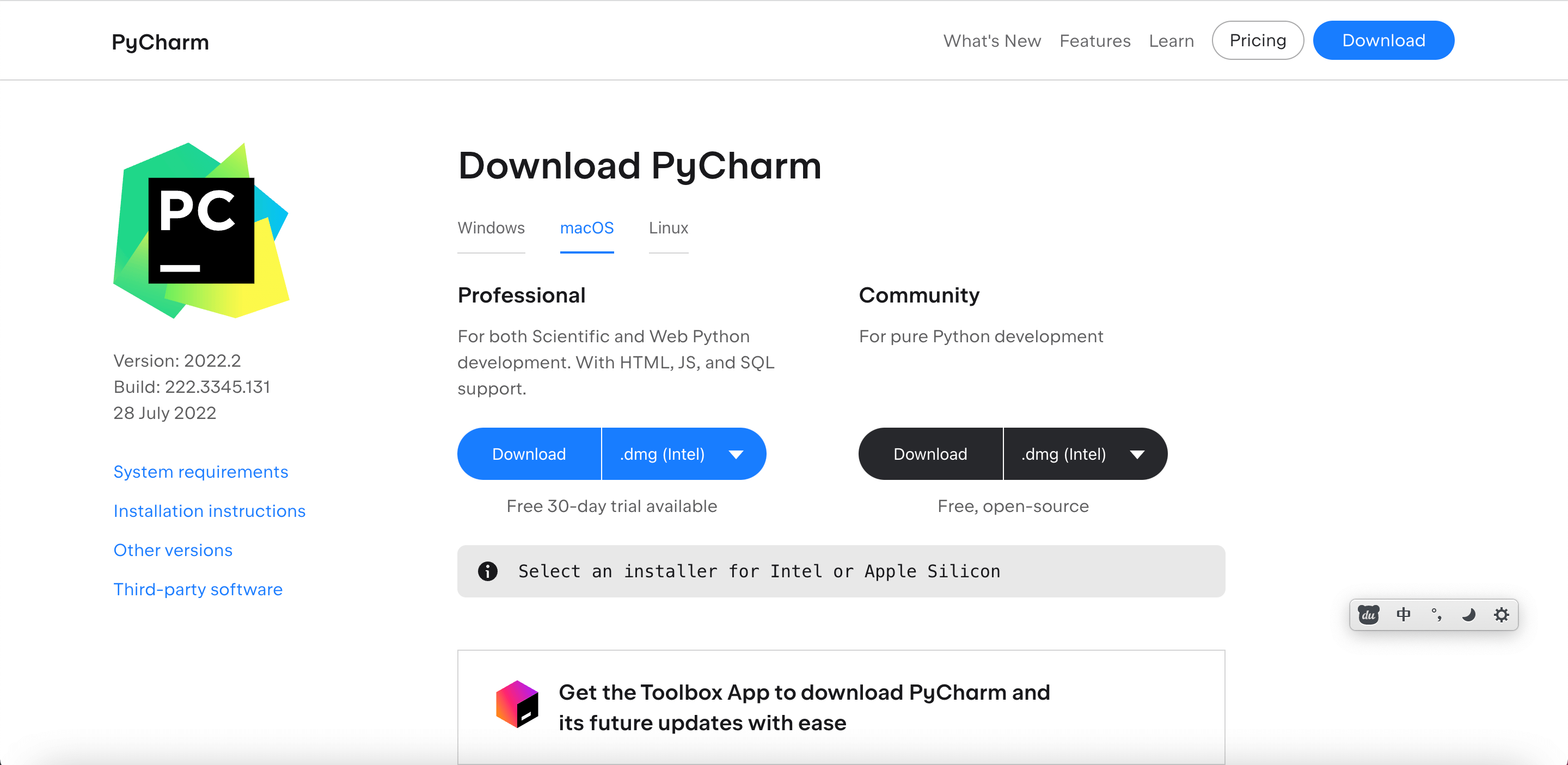 下载pycharm社区版 发表于 2022-07-29 | 分类于 python 打开官网 https://www.jetbrains.com/pycharm/ 点击download 选择系统 然后选择Community 下载即可