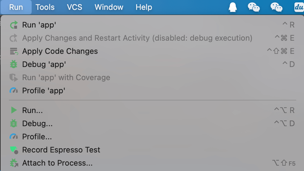 菜单栏Run->Debug'app'
