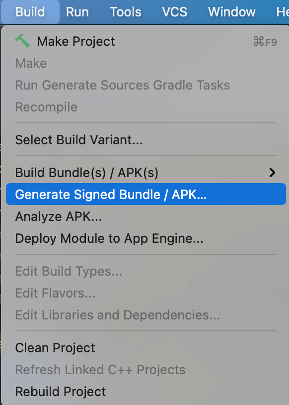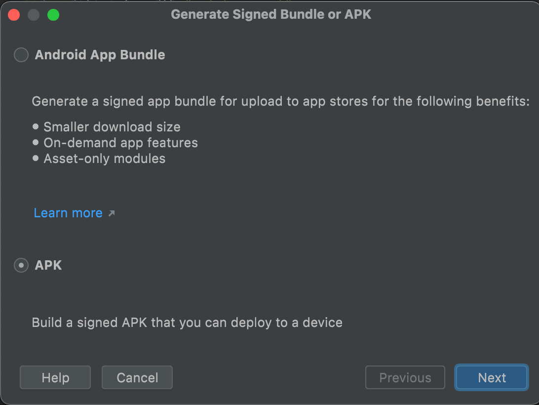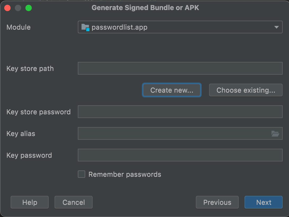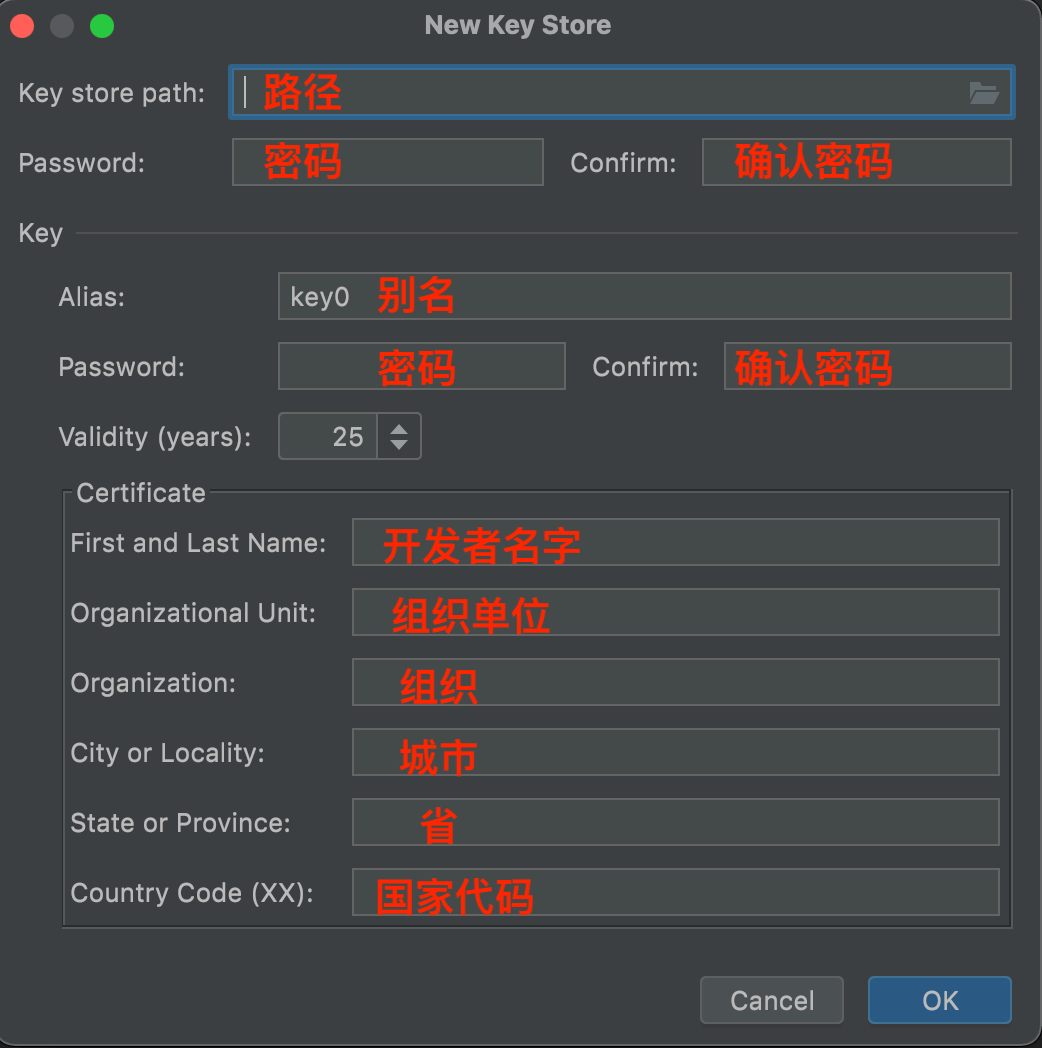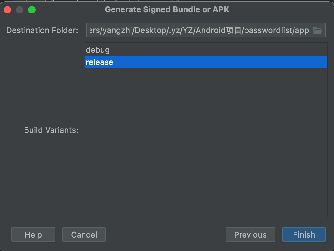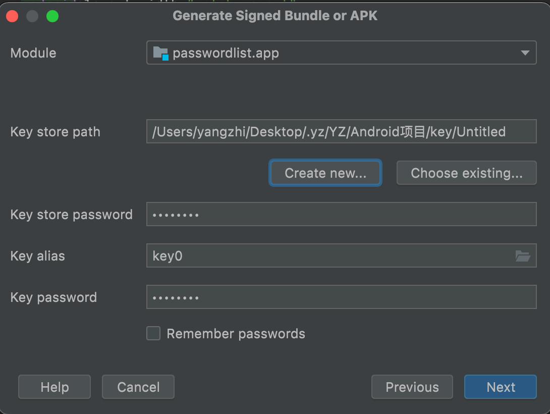 Android Studio 打包apk 发表于 2022-08-23 | 分类于 Android 选择顶部菜单栏 Build->Generate Signed Bundle/APK 然后选择APK 然后next 这个时候就要选择密钥了 没有的话就点击Create new新建一个 点击Create new就会出现下面的界面 按照上面的提示填完即可 填完以后就会自动选择刚才创建的密钥 然后继续next 选择release然后Finish 然后等待几分钟以后安装包就打包好了 路径就在项目所在文件夹下app文件夹里面release文件夹里